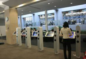 沒(méi)有進(jìn)行網(wǎng)上預約的同學(xué)可以進(jìn)行現場(chǎng)預約,一般在圖書(shū)館入口處放置一個(gè)觸摸一體柜。系統可采用讀者自選和隨機派發(fā)兩種方式進(jìn)行派位。讀者持本人校園卡在閱覽室觸摸屏一體機上刷卡選取座位、取號。