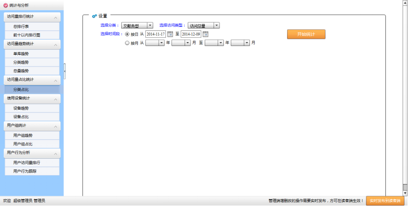點(diǎn)擊菜單【統計與分析>>訪(fǎng)問(wèn)量趨勢統計>>分類(lèi)趨勢】,打開(kāi)分類(lèi)趨勢圖的設置頁(yè)面。